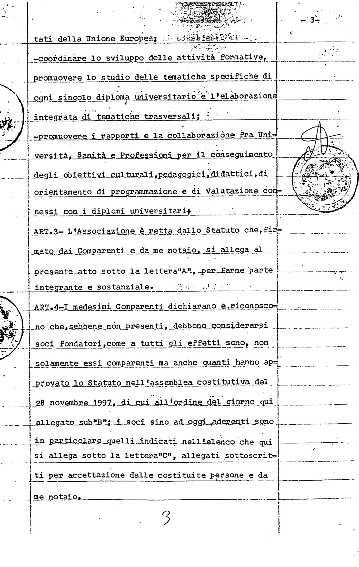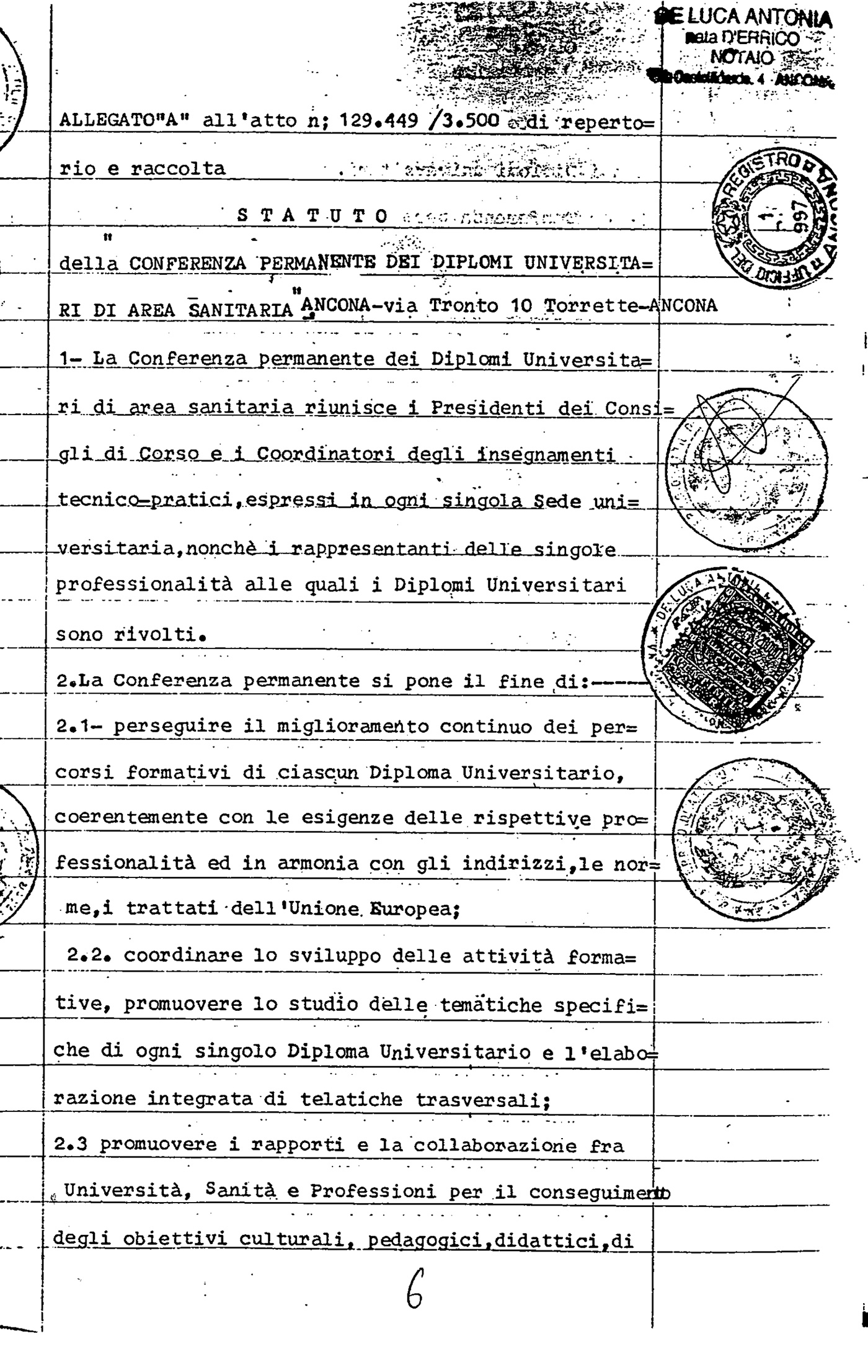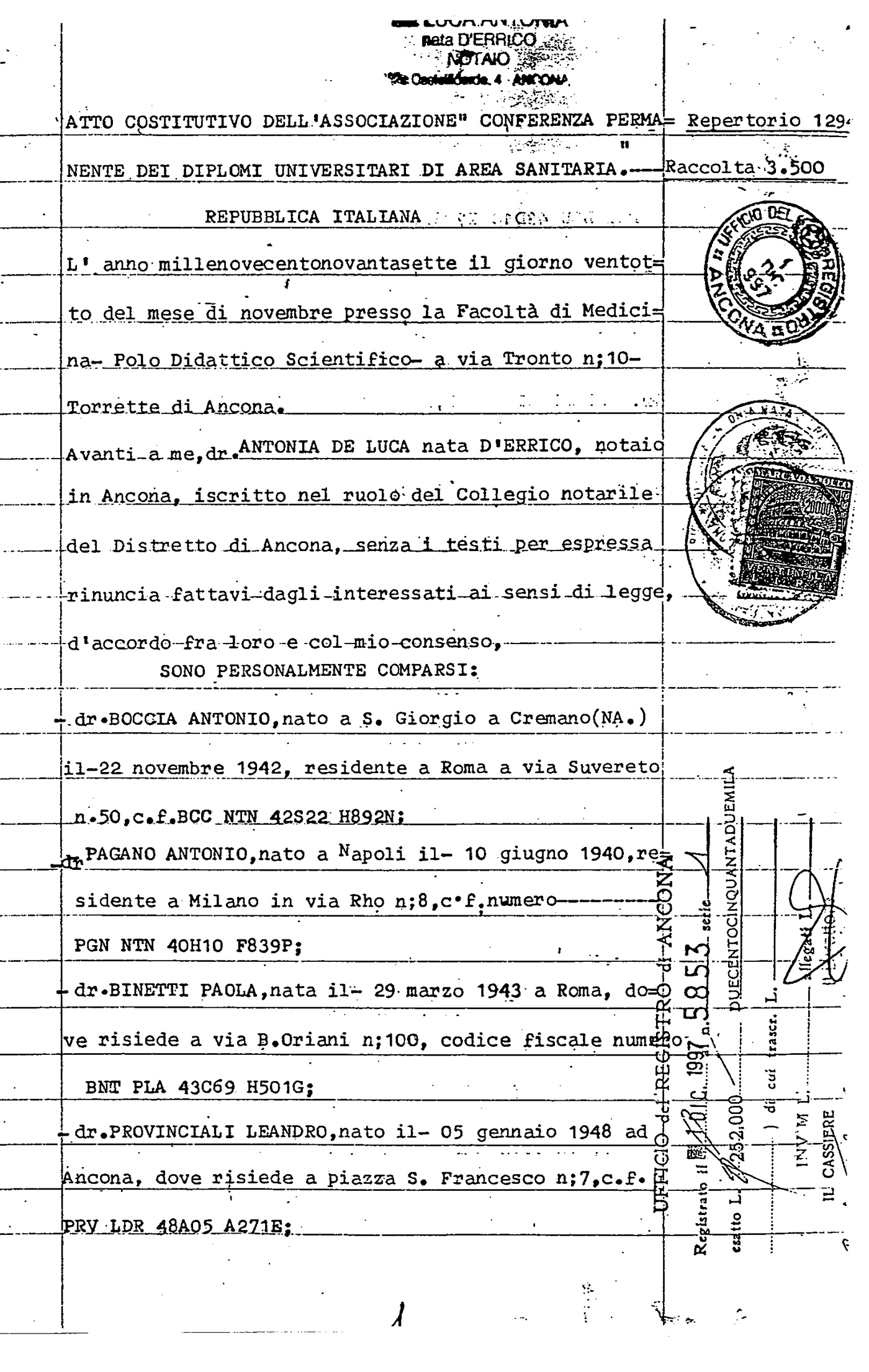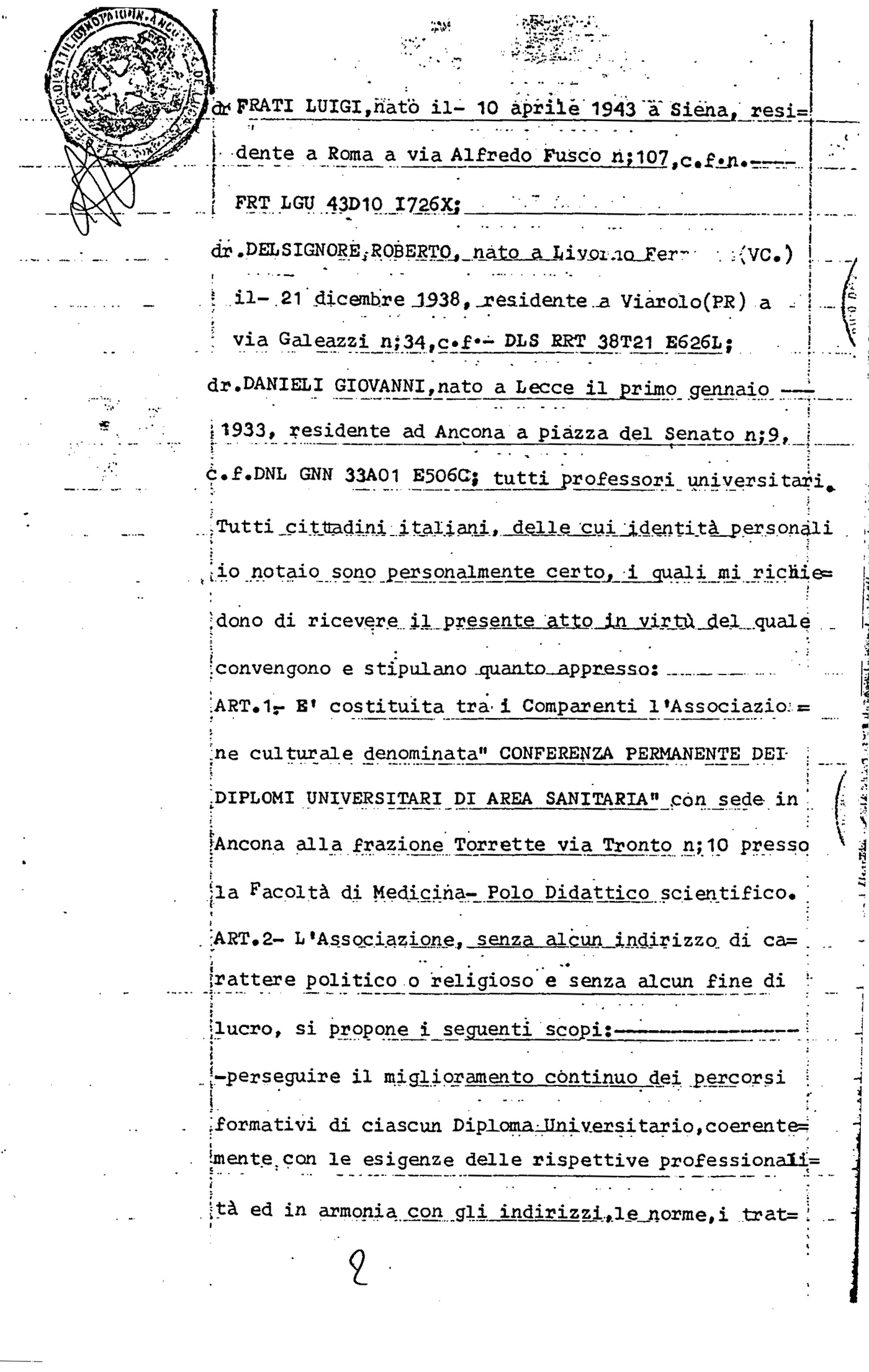 Atto costitutivo, notaio Antonia De Luca, sottoscritto da 7 Professori: Boccia Antonio (Roma Sapienza), Pagano Antonio (Milano), Binetti Paola (Roma Campus), Provinciali Leandro (Ancona), Frati Luigi (Roma Sapienza), Del Signore Roberto (Parma) e Danieli Giovanni (Ancona)